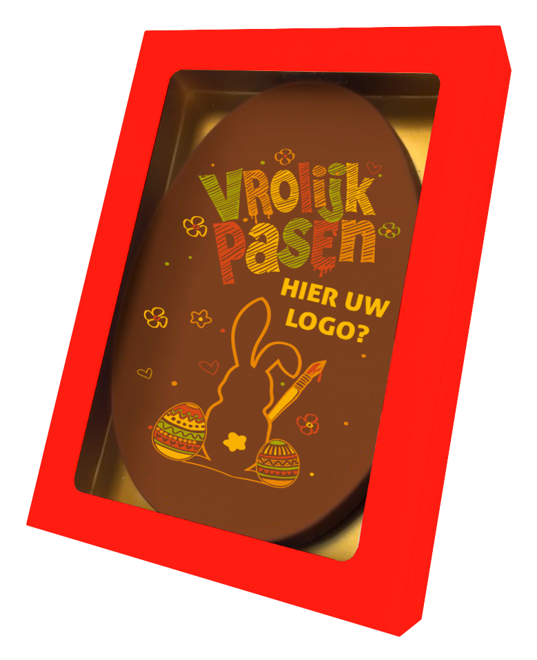 Plak chocolade wat rechtstreeks bedrukt wordt met een standaard Paas afbeelding. Het is mogelijk de kaart extra te voorzien van een logo of tekst in de kleur GEELGOUD.