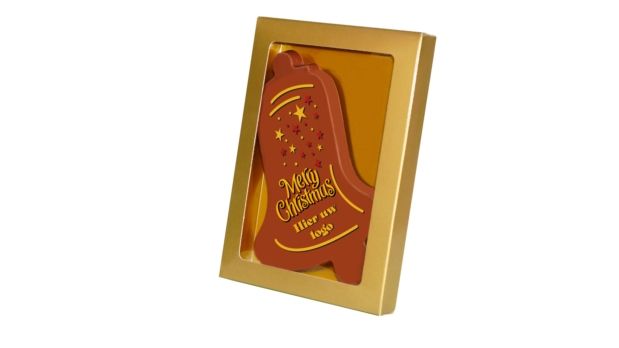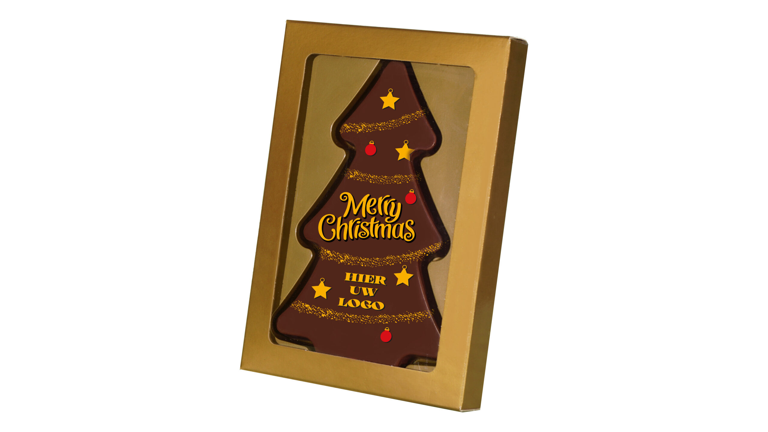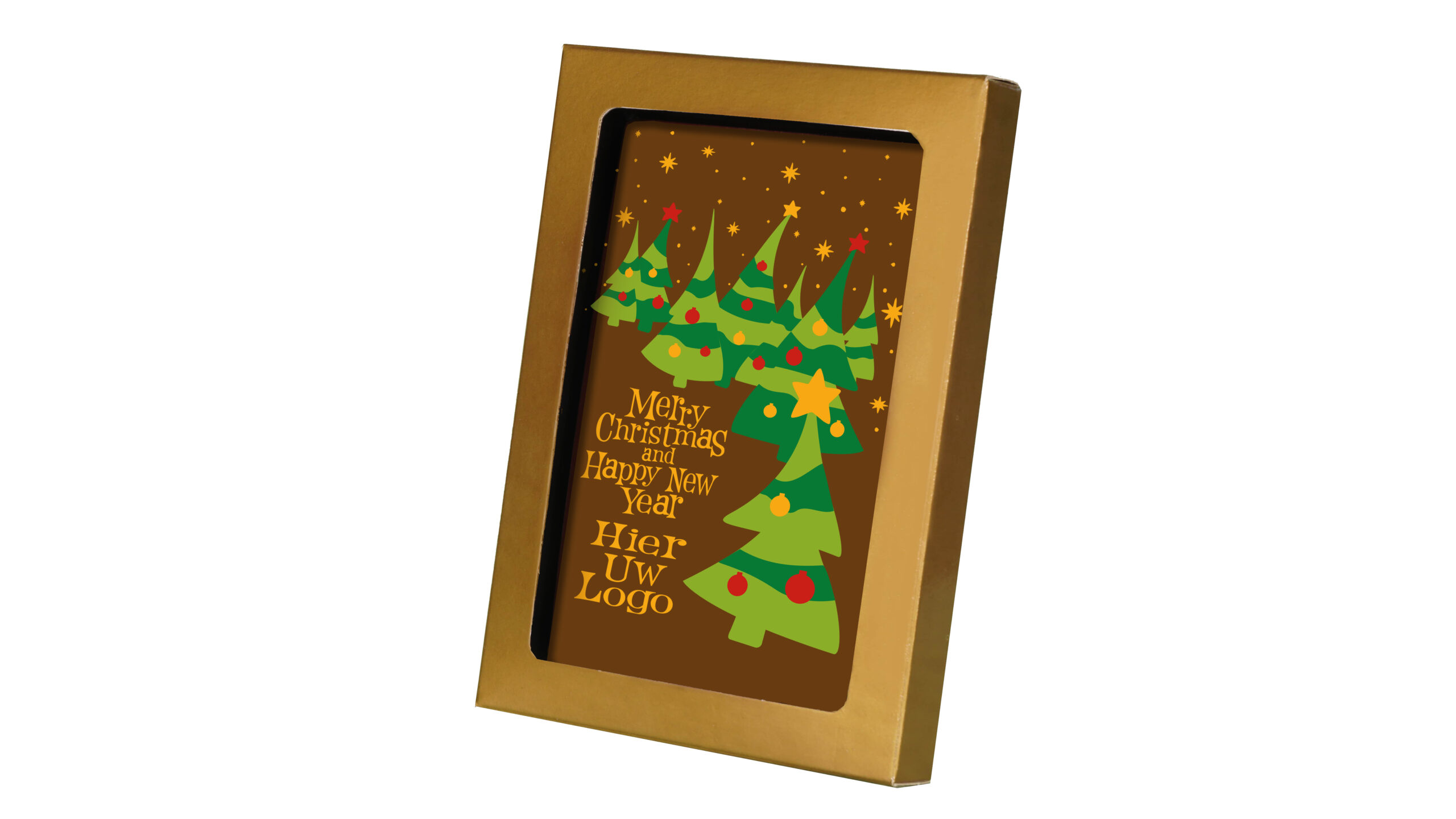 Plak chocolade die rechtstreeks wordt bedrukt met een standaard Kerst afbeelding. Het is mogelijk de kaart te voorzien van een logo of tekst in de kleur WIT. De chocoladekaart wordt verpakt in een wit, rood of goud vensterdoosje. De chocoladekaart kan ook per stuk verpakt verstuurd worden in een brievenbus verzenddoosje.