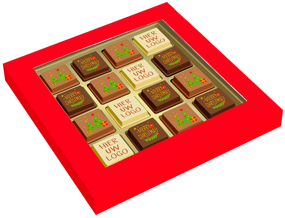 Geschenkdoosje met venster gevuld met 16 Kerstpralines. Het is mogelijk 4 witte pralines te bedrukken met uw logo in full colour.
