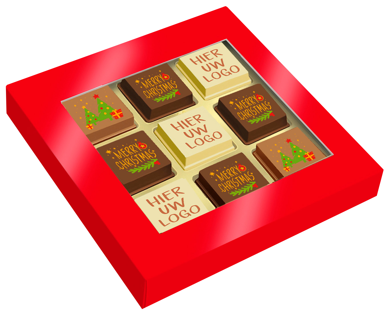 Geschenkdoosje met venster gevuld met 9 Kerstpralines. Het is mogelijk 3 witte pralines te bedrukken met uw logo in full colour.