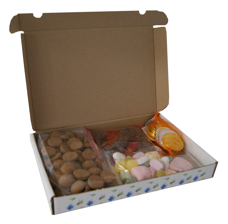 Brievenbusdoosje met klep voorzien van een gezellige Sinterklaas bedrukking. Het doosje is gevuld met een chocoladeletter, netje chocolademunten, zakje kruidnootjes en zakje Sint schuim. Op de producten ligt een kaart met een bedrukking naar eigen wens. Het doosje kan ook gevuld worden met een zakje met 250 gram kruidnootjes.