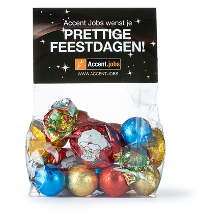 Transparant zakje gevuld met 10 roomboter Kerstkransjes of kerstchocolaatjes. Het zakje wordt voorzien van een kopkaartje dat naar eigen wens full colour bedrukt wordt.