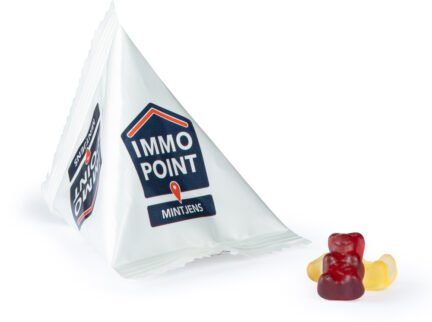 Geef uw merk een smaakvol tintje met deze vrolijke, driehoekige tetrazakjes boordevol kleurrijke fruitgum beertjes (10 gram per zakje).